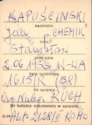 Karta E-59 dot. Jana Kapuścińskiego z kartoteki członków nielegalnych organizacji, wytworzona przez Stołeczny Urząd Spraw Wewnętrznych w Warszawie, sygn. IPN BU 0632/42