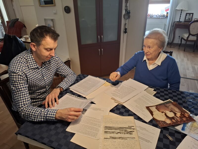 Maria Kapuścińska i pracownik Archiwum IPN Mariusz Jonczyk podczas przekazywania materiałów archiwalnych, Łódź, 16 IV 2025 r.