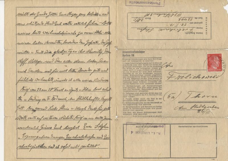 Strona listu ks. Stefana W. Frelichowskiego z KL Dachau do rodziny, 1944 r.