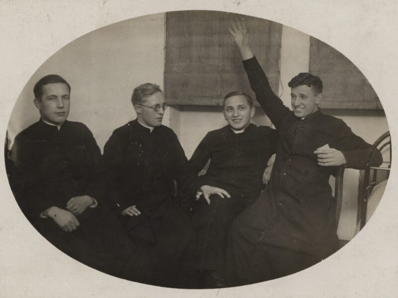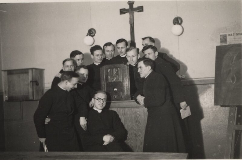 Klerycy słuchający radia. Drugi od prawej: Wicek, Pelplin, 1937 r.