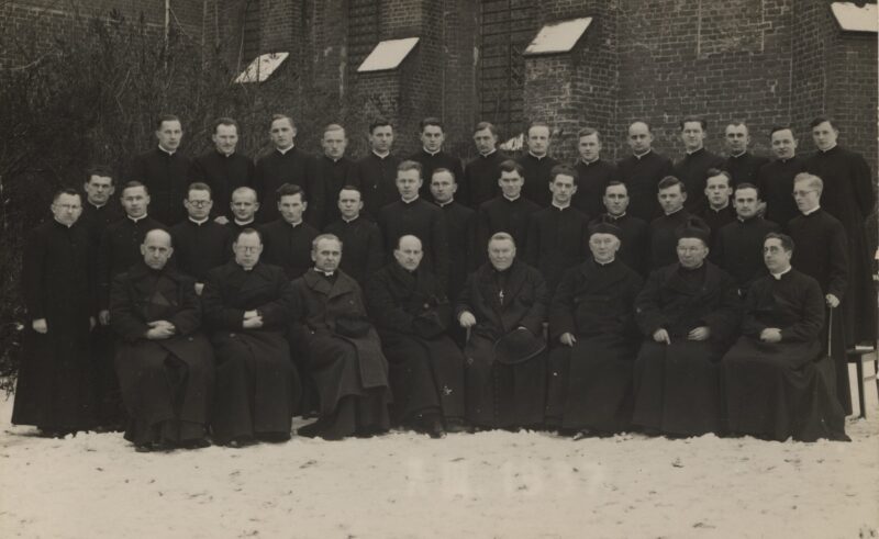 Absolwenci i profesorowie Wyższego Seminarium Duchownego w Pelplinie z księdzem bp. Konstantym Dominikiem. W pierwszym rzędzie piąty od lewej stoi: ks. Stefan W. Frelichowski, 1937 r.