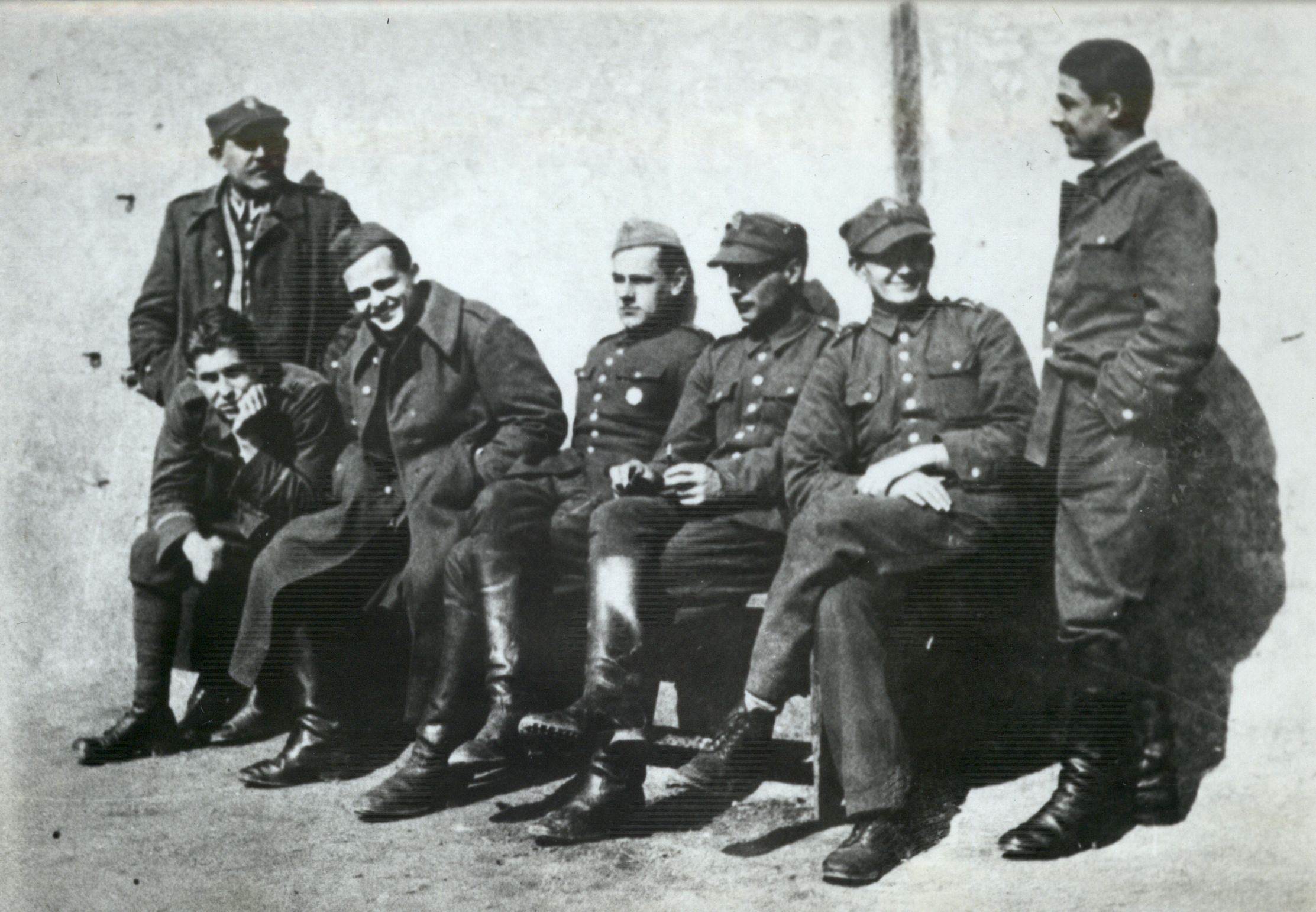 Obóz internowania polskich oficerów - folwark Bregenc-major w Fertőszentmiklós koło Sopronu na Węgrzech, Stefan Drouet siedzi drugi od lewej, 1939 r.