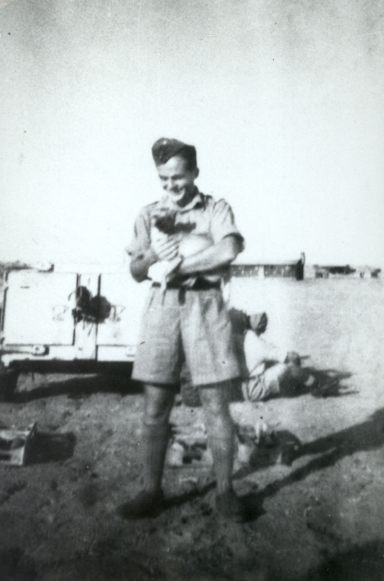 Stefan Drouet z ratlerką "Bardią" znalezioną w Bardii po zdobyciu twierdzy, Latrun w Palestynie, maj 1942 r.