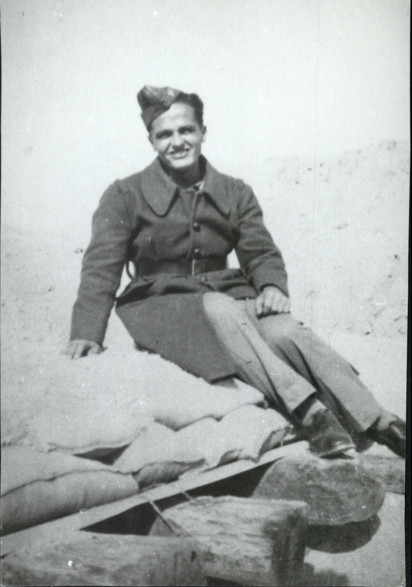 Stefan Drouet we francuskim płaszczu i angielskiej furażerce, siedzi na schronie pod Aleksandrią w Egipcie, 1940 r.