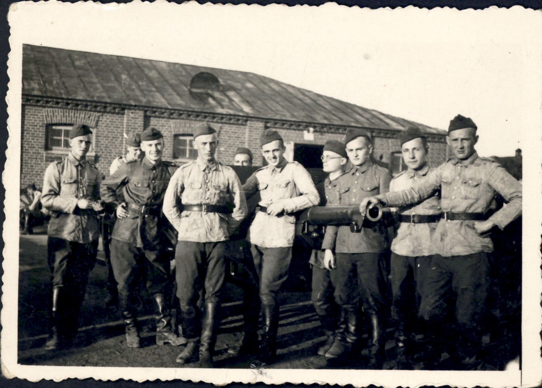 Kadeci Szkoły Podchorążych Rezerwy Artylerii w czasie przerwy w działoczynach, pośrodku Stefan Drouet, Włodzimierz Wołyński, 1937 r.