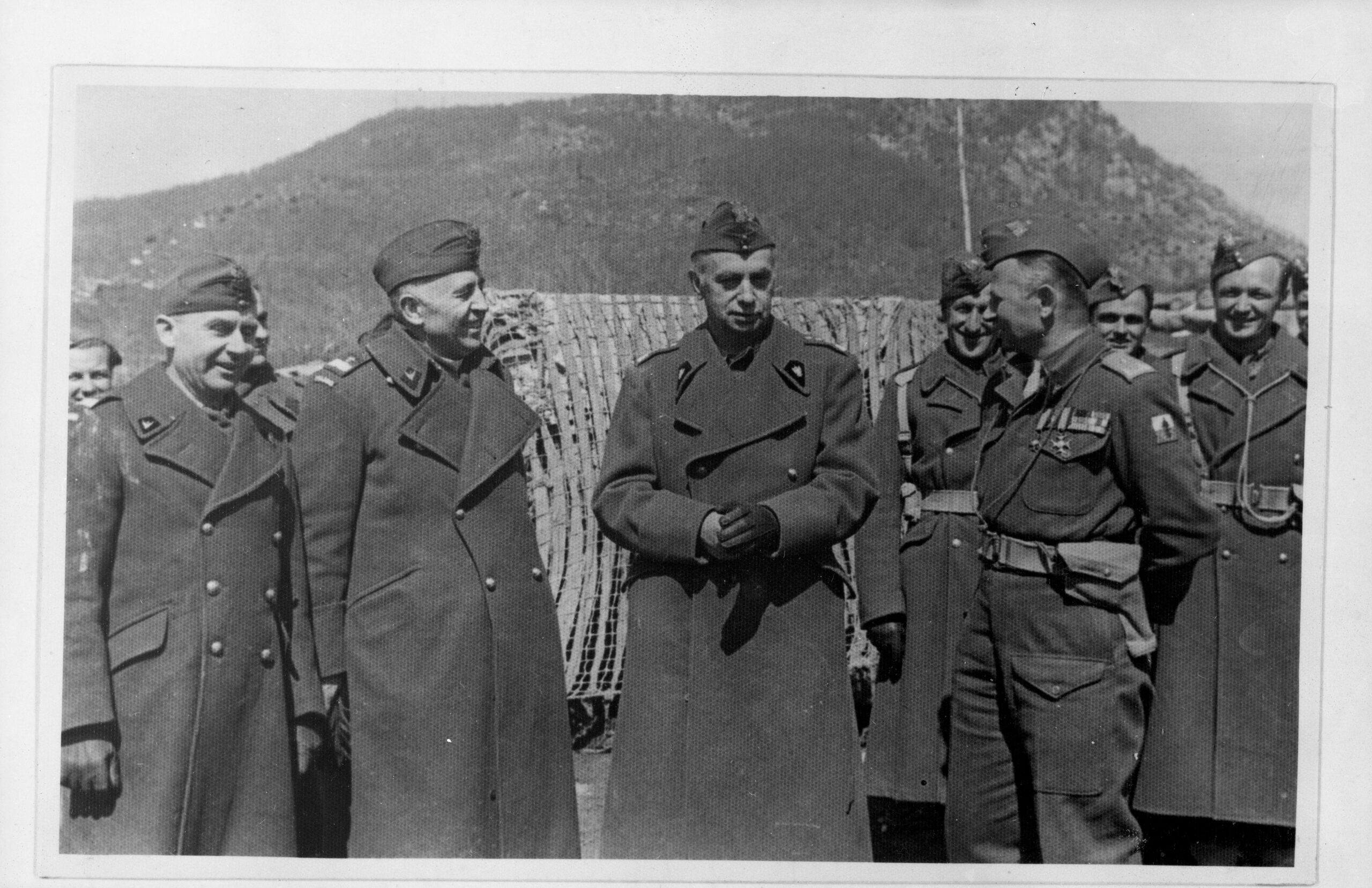 Wizytacja stanowisk nad rzeką Sangro. Od lewej stoją: gen. Stanisław Kopański, bp Józef Gawlina, Naczelny Wódz gen. Kazimierz Sosnkowski, gen. Bronisław Duch. Za generałem mjr Jerzy Janasiewicz, Stefan Drouet i ppor. Nejman, marzec 1944 r.