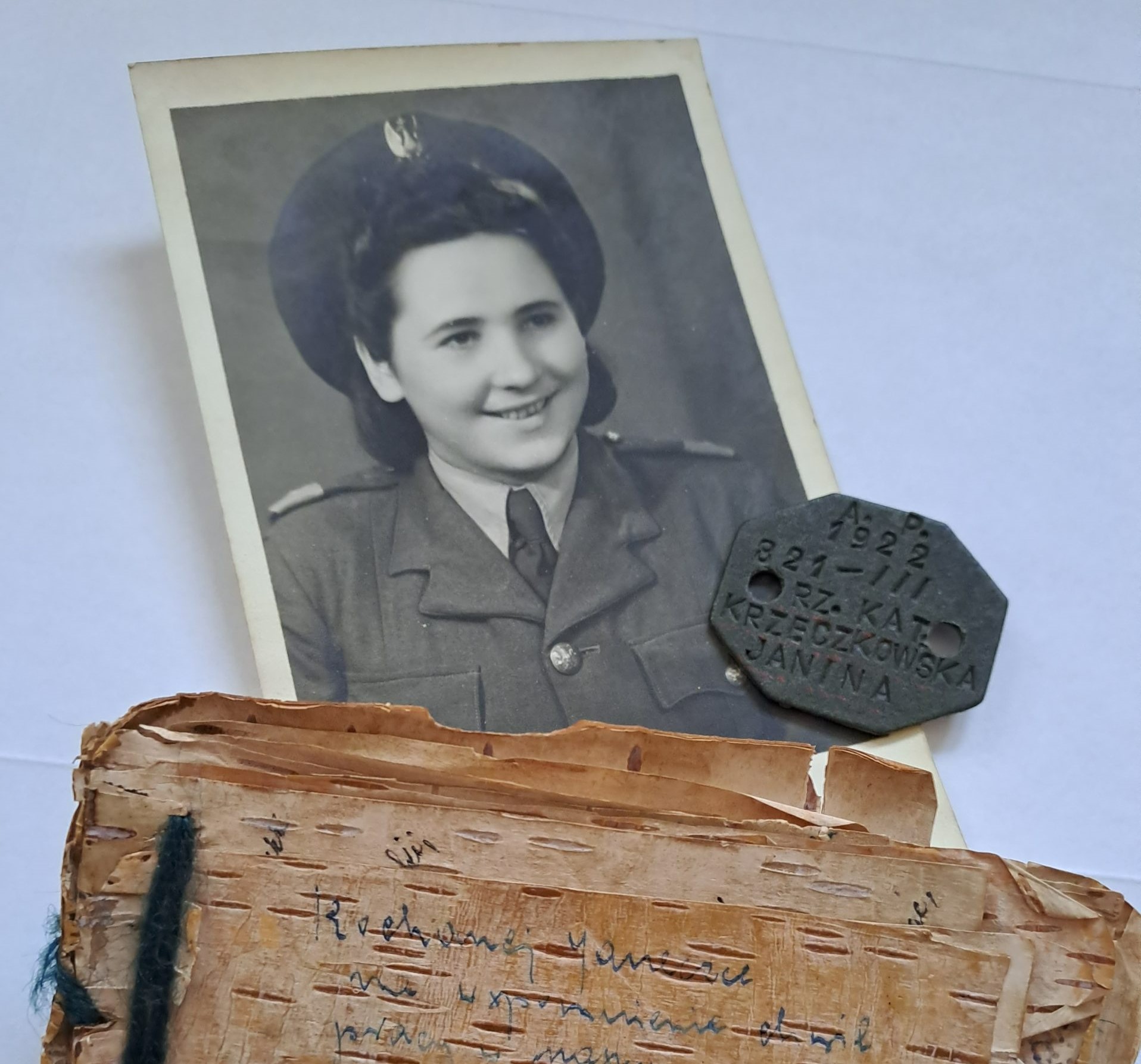Fotografia portretowa Janiny Krzeczkowskiej (Broszkiewicz) oraz jej pamiętnik na korze brzozowej. Fot. Justyna Staroń