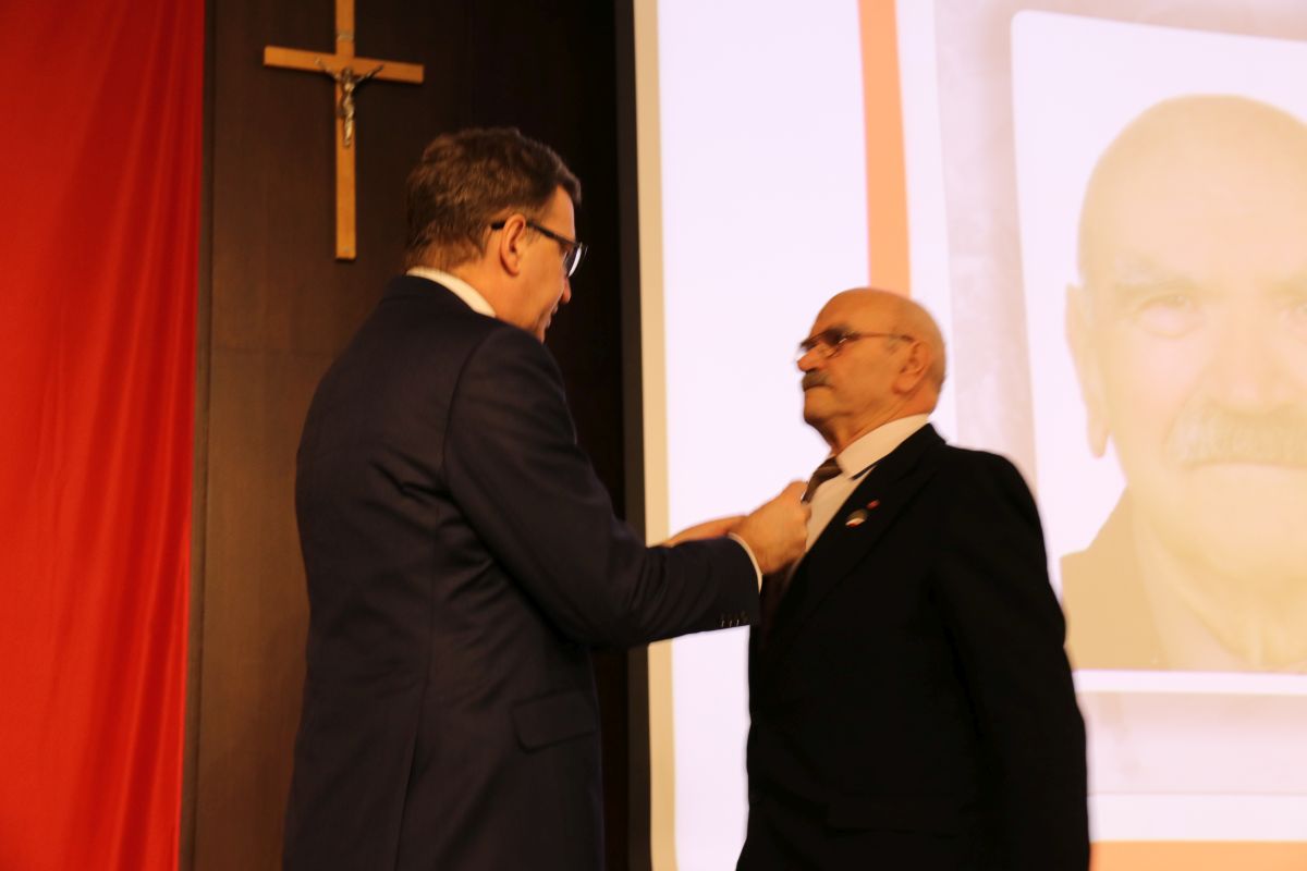 Jan Antczak przyjmuje z rąk Prezesa IPN dr. Jarosława Szarka odznaczenie Krzyż Wolności i Solidarności, Sala BHP Stoczni Gdańskiej 17 grudnia 2018 r., fot. IPN