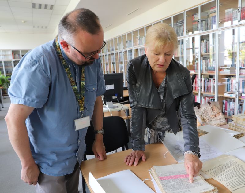 Mirosława Brzezińska z pracownikiem Oddziałowego Archiwum IPN w Gdańsku podczas przekazywania materiałów do zasobu archiwalnego Instytutu, 25 VII 2023 r.