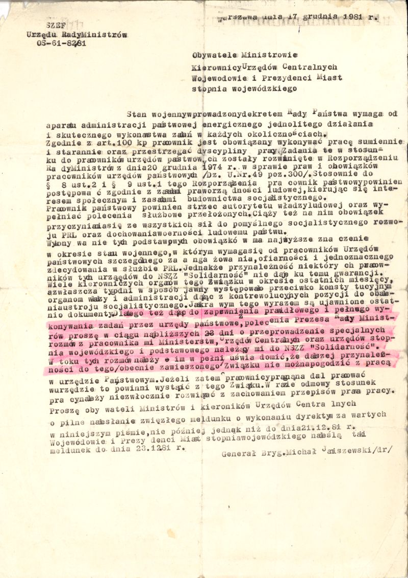 Pismo Szefa Urzędu Rady Ministrów gen. Michała Janiszewskiego do kierowników urzędów centralnych i wojewódzkich nakazujące przeprowadzenia rozmów dyscyplinujących z członkami "Solidarności", 1982 r.