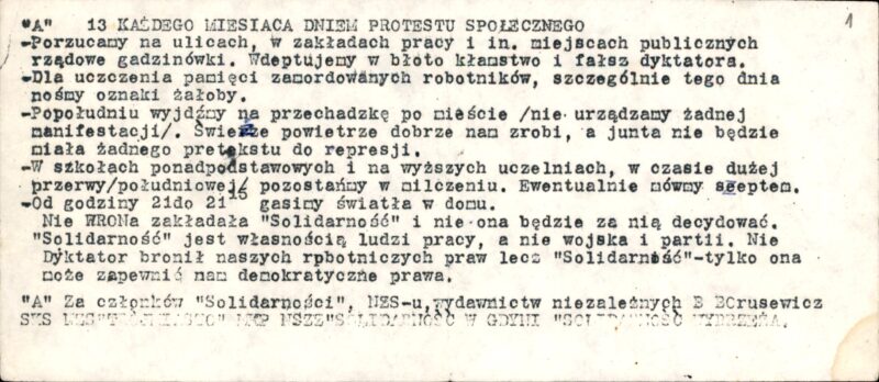 Ulotka SKS NZS „Trójmiasto”, MKP NSZZ „Solidarność” w Gdyni, „Solidarności Wybrzeża” pt. „13 każdego miesiąca dniem protestu społecznego” z 1982 r. wzywająca do manifestowania oporu w miesięcznice wprowadzenia stanu wojennego