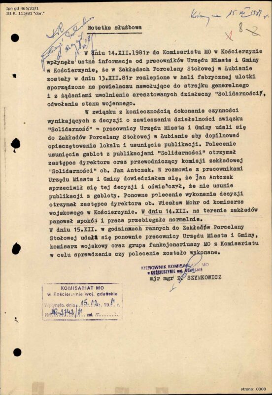 Notatka służbowa Kierownika Komisariatu MO w Kościerzynie z 15 grudnia 1981 r. w aktach sprawy karnej p-ko Janowi Antczakowi, i in. dot. akcji ulotkowej NSZZ "Solidarność" na terenie Zakładu Porcelany Stołowej "Lubiana", IPN Gd 465/23, t. 1