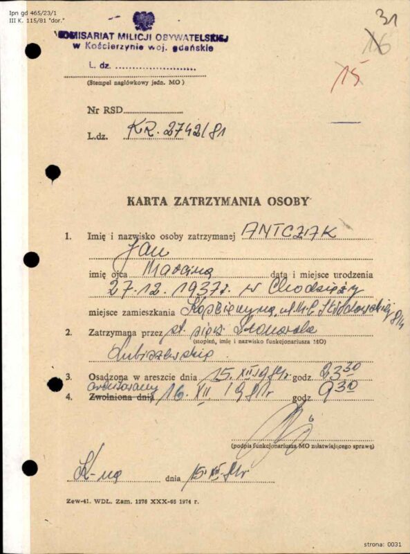 Karta zatrzymania Jana Antczaka 15 grudnia 1981 r., IPN Gd 465/23, t. 1