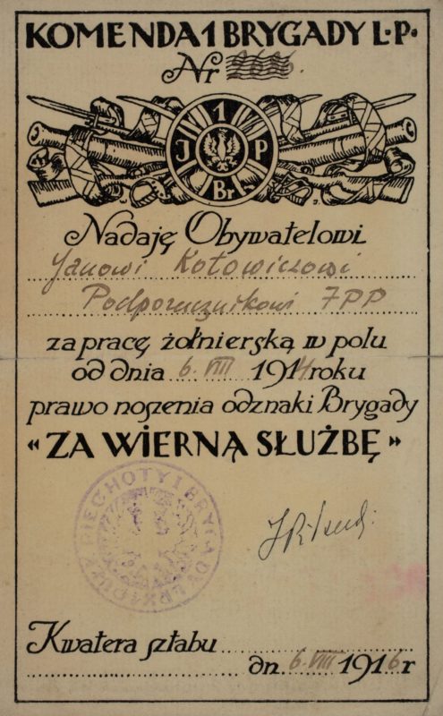 Akt nadania ppor. J. Kotowiczowi prawa noszenia odznaki I Brygady Legionów Polskich „Za wierną służbę” z 6 sierpnia 1916 r.